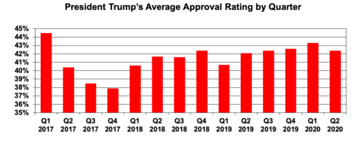 What is clear is that Joe Biden is currently in a much stronger position than Hillary Clinton was at any point during the campaign in 2016. This is due primarily to President Trump’s low approval ratings, which resemble those of the last two presidents to lose their bids for a second term in office, Jimmy Carter and George HW Bush. If the president intends to win a second term in office, he is going to have to regain support from voters outside of his core base, which account for around 35%-40% of the US electorate.