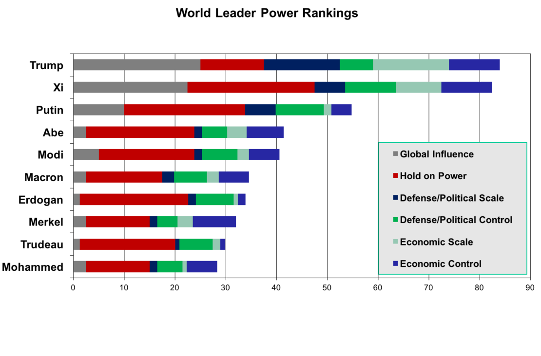 With these six factors, we developed a ranking of the world’s most powerful political leaders at the start of 2018 (see chart above).