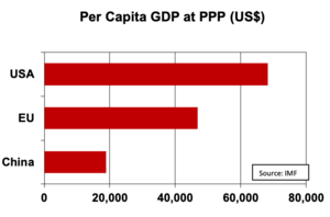 In terms of wealth comparisons, the US has a per capita GDP at purchasing power parity (PPP) of $68,309, while the EU’s stands at $46,888.